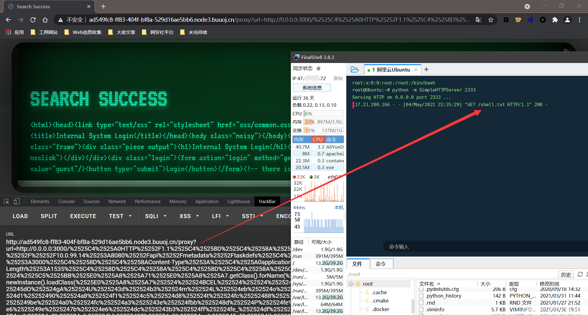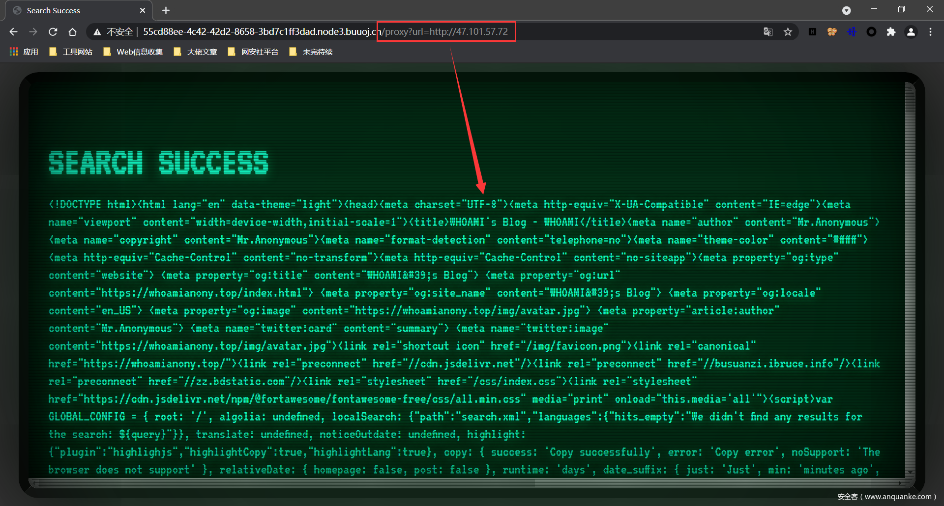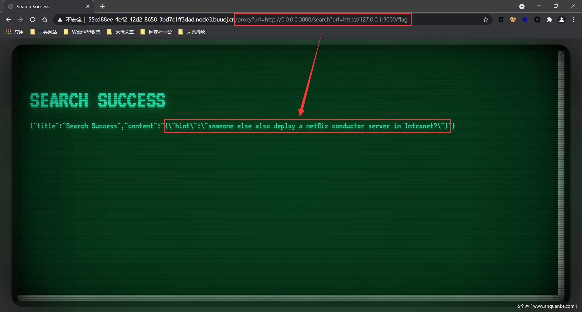 那我们便可以成功进行 SSRF 了,像那些只限制本地访问的接口,比如 /search,就能访问了。并且,由于题目对 /search 路由做的限制仅限于从本地访问,那我们的思路便是通过 /proxy 代理路由去访问一些真从从本地访问的路由,比如 /search 路由,然后通过这个 /search 路由去进行 SSRF 去访问 /flag 路由: