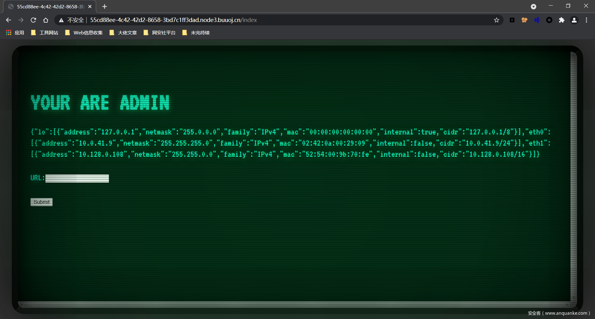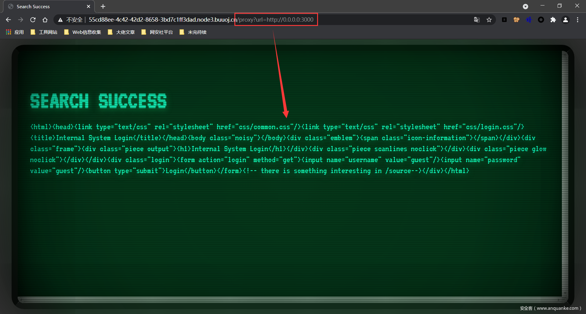 这里前面几个 WAF 对 /proxy 路由做了限制,要求输入的 URL Host 为 IP 且为公网 IP,且目录不以 /flag 开头。那么就要想办法绕过一下,最简单的办法,就是尝试一下 0.0.0.0,请求时如果用这个地址,会默认访问到本机上。只要是本机监听的端口,都会被请求到。由于这个 NodeJS 服务默认是开在 3000 端口,所以我们输入 http://0.0.0.0:3000,成功了: