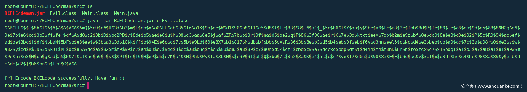 然后使用 javac 将 Evil.java 编译,然后再使用 BCELCodeman 这个工具将其转换为 BCEL 编码: