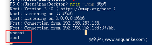 发送请求后,等待ncat获取反弹shell,可见在恶意代码中构造的命令执行,成功反弹shell,可以执行命令