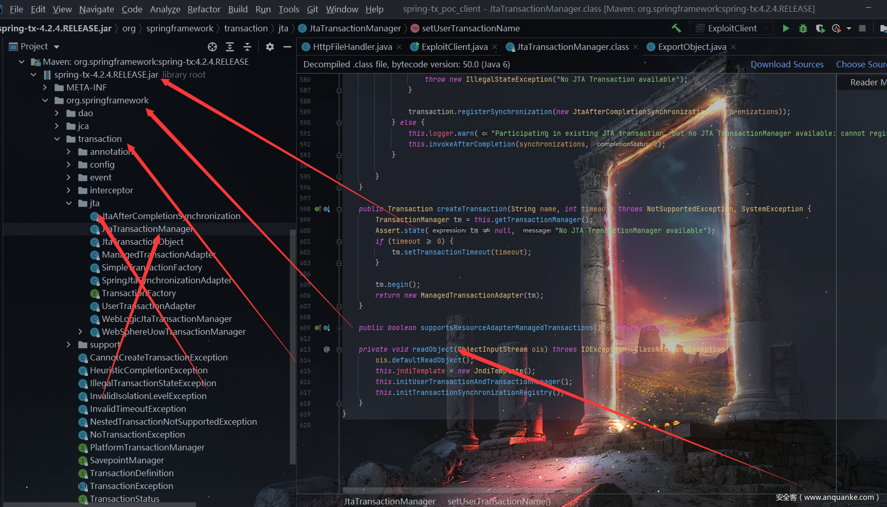创建一个Spring中JtaTransactionManager对象,调用setter封装的setUserTransactionName函数对UserTransactionName属性进行赋值,上文封装的jndi地址就是值。