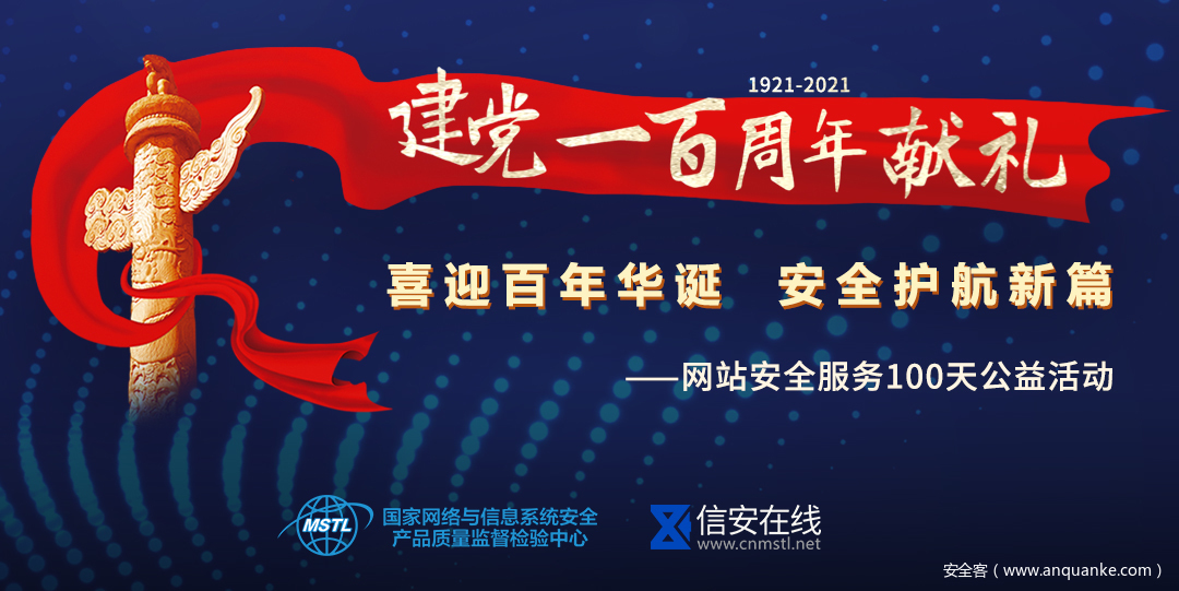 为庆祝建党100周年营造良好的网络安全环境,提高全民维护国家安全意识,切实做好建党100周年网络安全保障工作。国家网络与信息系统安全产品质量监督检验中心(公安部第三研究所)依托“信安在线”服务平台特举办建党100周年献礼—“喜迎百年华诞 安全护航新篇”网站安全服务100天公益活动。