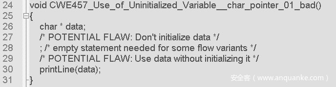 在上述示例代码中,第26行对变量 data 进行定义,但没有进行初始化,随后在第30行 data 作为 printLine() 函数的参数传入,由于此时 data 并没有初始化,其值也是未定义的,因此存在“参数未初始化”问题。