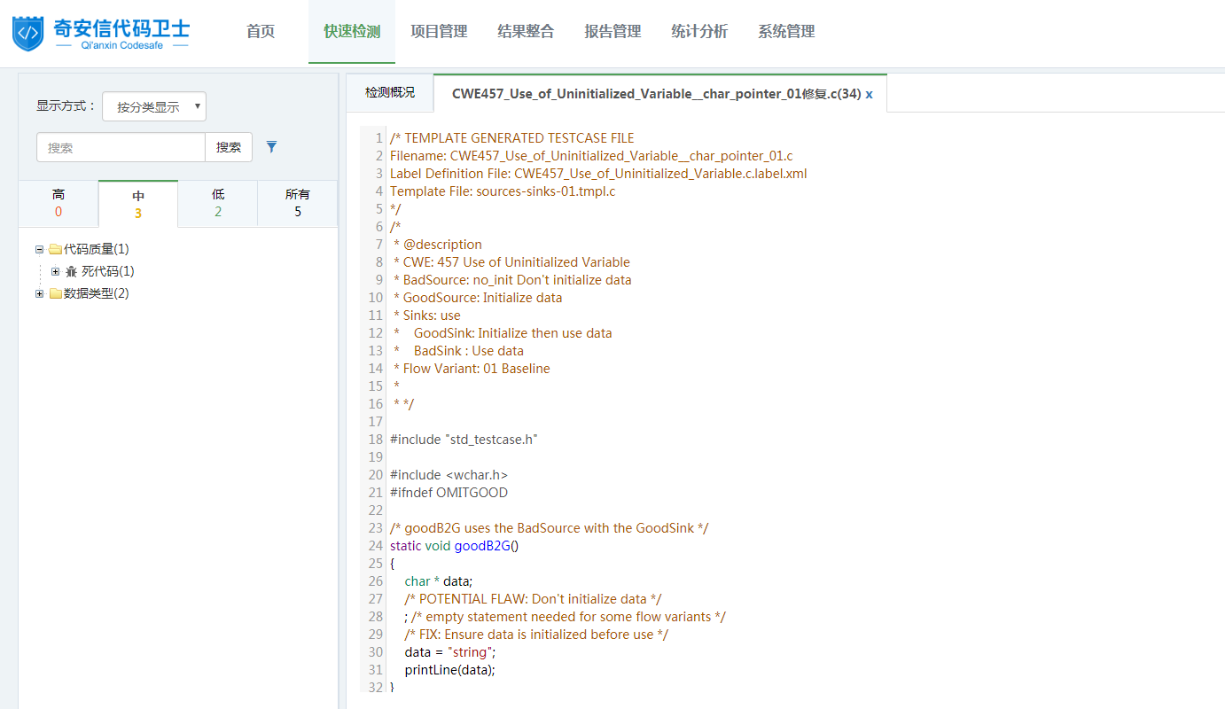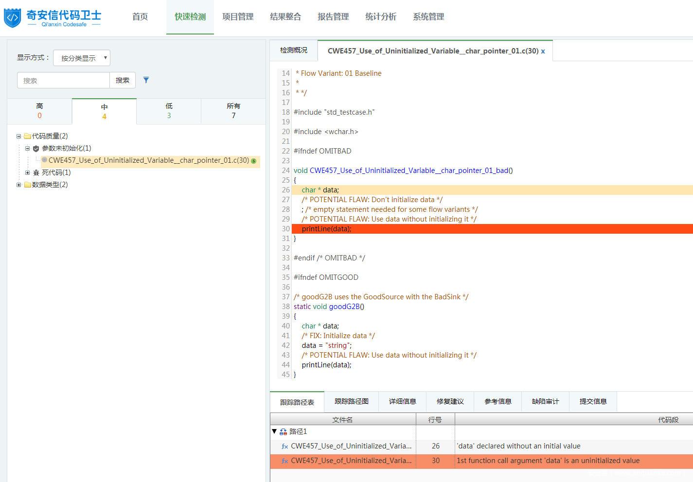 使用代码卫士对上述示例代码进行检测,可以检出“参数未初始化”缺陷,显示等级为中。如图1所示: