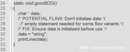 在上述修复代码中,Samate 给出的修复方式为:在第30行对 data 进行赋值,从而避免了“参数未初始化”。