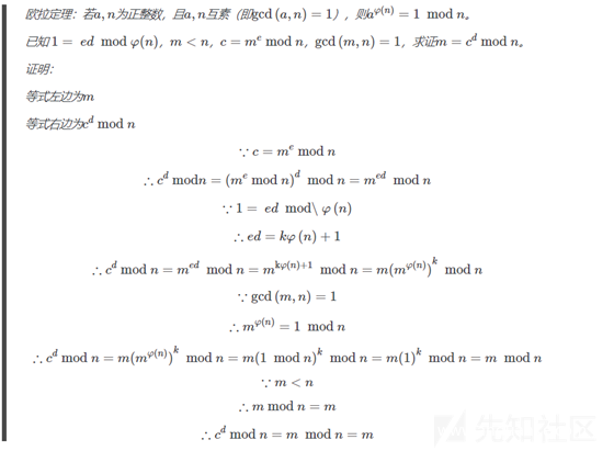 然后利用欧拉定理,我们直接利用上文中提到的RSA的解密证明中的结论