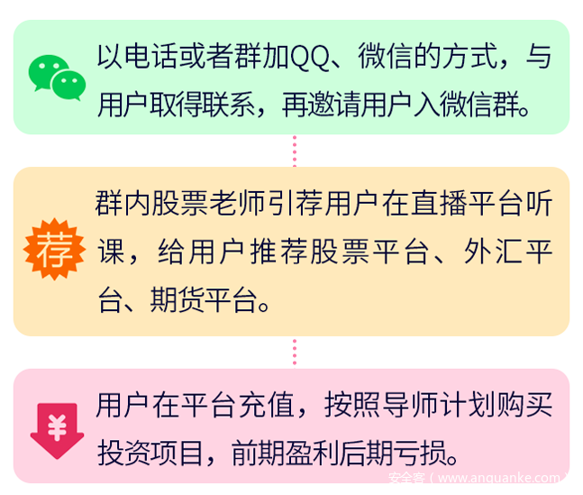 即以荐股为名,吸引用户在虚假平台投资,骗取资金。