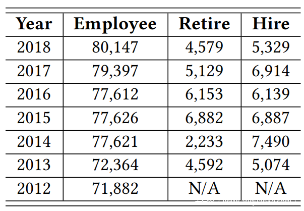 鉴于人口众多且命名约定很少,企业内的不同员工很可能会争夺同一个电子邮件地址。为了估计组织/企业级电子邮件地址冲突的概率,从纽约州大都会交通局 (MTA) 公布的员工工资记录中调查了其员工历史。该记录提供了2012年至2018年的员工名单。下表给出了该记录的统计信息,包括员工总数和每年退休或聘用的员工人数。例如,2018年,MTA拥有80147名员工(对于许多大型企业来说是合理的规模),公司退休4579人,招聘5329人。雇用/退休信息能够推断电子邮件地址重复使用的可能性。