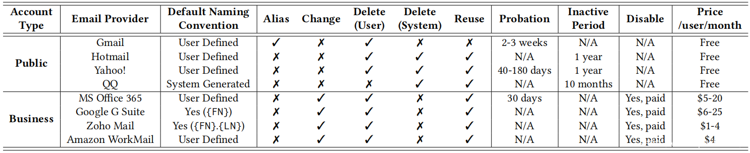 大多数电子邮件提供商为两大客户群提供服务:一般公众和商业企业。这两个群体的账户管理策略有显着差异:公共账户主要由电子邮件提供商管理,但业务管理员拥有更多管理其业务账户的能力。在研究中,为公共和企业帐户选择了四个具有内置 SSO 功能的流行电子邮件提供商来研究他们的帐户管理政策。具体来说,Gmail、Hotmail 和 Yahoo!占美国电子邮件市场的 85%,QQ 邮箱在中国支持超过 8 亿活跃用户。结果列于下表中。