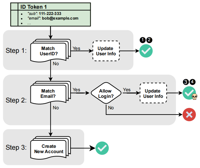 第一步:第一步是识别与给定用户身份相关联的现有帐户。它首先检查用户 ID(存储在“sub”字段中)以搜索匹配的帐户。一旦识别出匹配的帐户(情况 ❶ 和 ❷),系统就会执行配置检查,以确定是否允许使用匹配的 UserID 更新用户属性。如果允许,SP 会修改存储在用户帐户中的信息并修改过时的信息以与用户身份保持一致。例如,在情况❷中,帐户数据库中的电子邮件地址可能会根据 SSO 令牌中的身份信息进行更新。最后,用户认证成功,无论用户信息是否可以更新,都允许用户访问匹配的帐户。