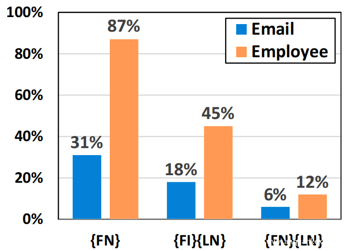 大型企业或组织通常对其员工和附属成员采用一致的命名约定,从而实现全自动管理系统。对 2012 年财富 1000 强企业名单中的 971 家企业认可的电子邮件约定数据库进行了分析,结果如下图所示。请注意,有些公司可能会采用多种命名约定。结果表明,前五个基于姓名的电子邮件约定占总格式的 89.6%。前两个最流行的命名约定,{Firstname}{Lastname} 和 {Firstname}.{Lastname},被 661 个组织采用,占公司总数的 68.1%。
