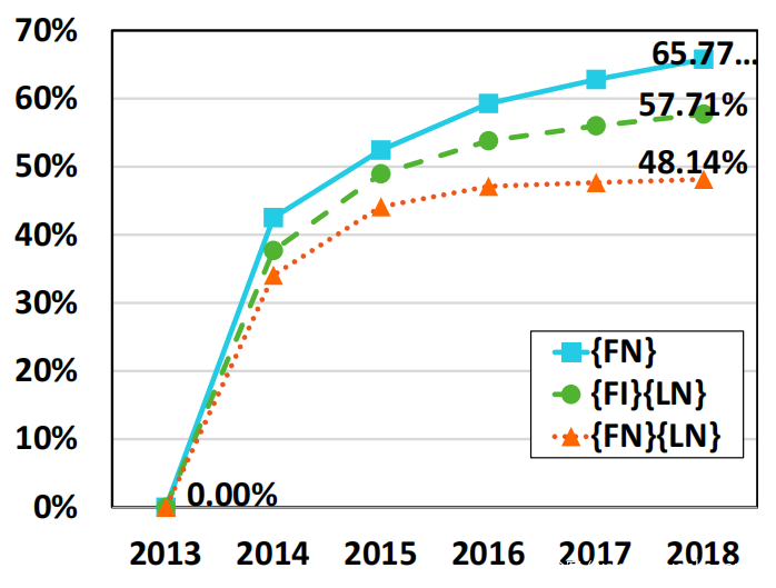 接下来调查由于退休/雇用程序而重复使用电子邮件地址的可能性。假设一个电子邮件地址在员工退休时被释放,然后可以在以后重新签名给新聘用的员工。 2013 年,有 4,592 名员工从 MTA 退休,这可能导致案例 {Firstname} 的 1,341 个电子邮件地址、案例 {Firstinitial}{Lastname} 的 4,301 个以及案例 {Firstname} {Lastname} 的 4,556 个电子邮件地址的释放。从 2014 年到 2018 年,每年有超过 5,000 名员工加入 MTA。然后研究了 2013 年发布的电子邮件地址被 2014 年到 2018 年新招聘的员工重复使用的概率。下图说明了结果。可以看到,在 2018 年底,48.14%、57.71% 和 65.77% 的电子邮件地址可能已被重新分配给案例 {Firstname}{Lastname}、{Firstinitial}{Lastname} 和 {Firstname }, 分别。即使对于涉及 {Firstname} 和 {Last name} 冲突可能性最小的命名约定,4,556 个电子邮件地址中的 2,193 个也可以在六年内重复使用。这些结果清楚地表明,在企业中重复使用电子邮件的可能性很大,而那些退休员工容易受到身份帐户不一致的威胁。