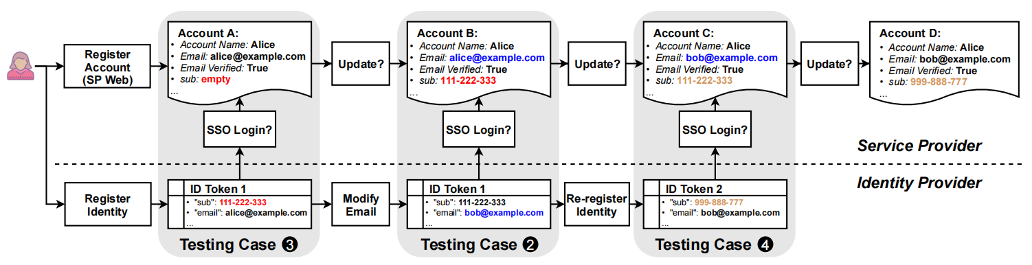 进一步测试情况❷。在 IdP 端,将身份的电子邮件地址修改为 bob@example.com。用户 ID 保持不变(即仍为“111-222-333”)。在 SP 端,如果帐户信息在上一步中更新,则帐户应具有相同的 UserID,但电子邮件地址为 bob@example.com。否则,手动将SP中的帐户与身份绑定以更新相关信息。然后检查 SP 是否允许使用相同的用户 ID 但不同的电子邮件地址进行 SSO 登录。同样,如果成功,会检查帐户信息是否更新(通过检查电子邮件地址)。