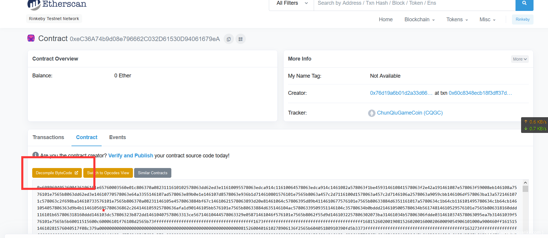 使用测试网络区块链浏览器查看交易列表 发现了合约地址