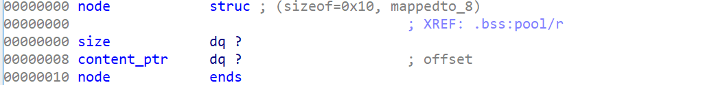 接下来又出现的是这两行,分别我们确定了 size 和 Content 指针存在的位置分别是 + 0 和 + 8,于是我们就可以根据已知的这个信息在 IDA 中建立一个结构体信息。