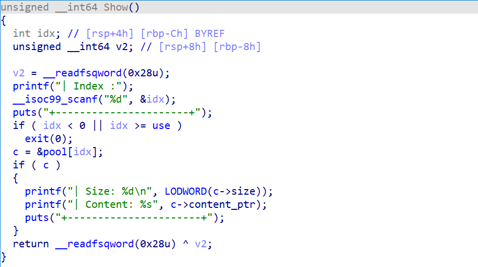 Show 函数一般是用来泄露 libc 地址的,在这道题中是用 printf 进行输出的,%s 遇到 00 数据会截断。但是在这道题中影响不到我们利用,不过我这里提及一下常见的的坑和解决办法。
