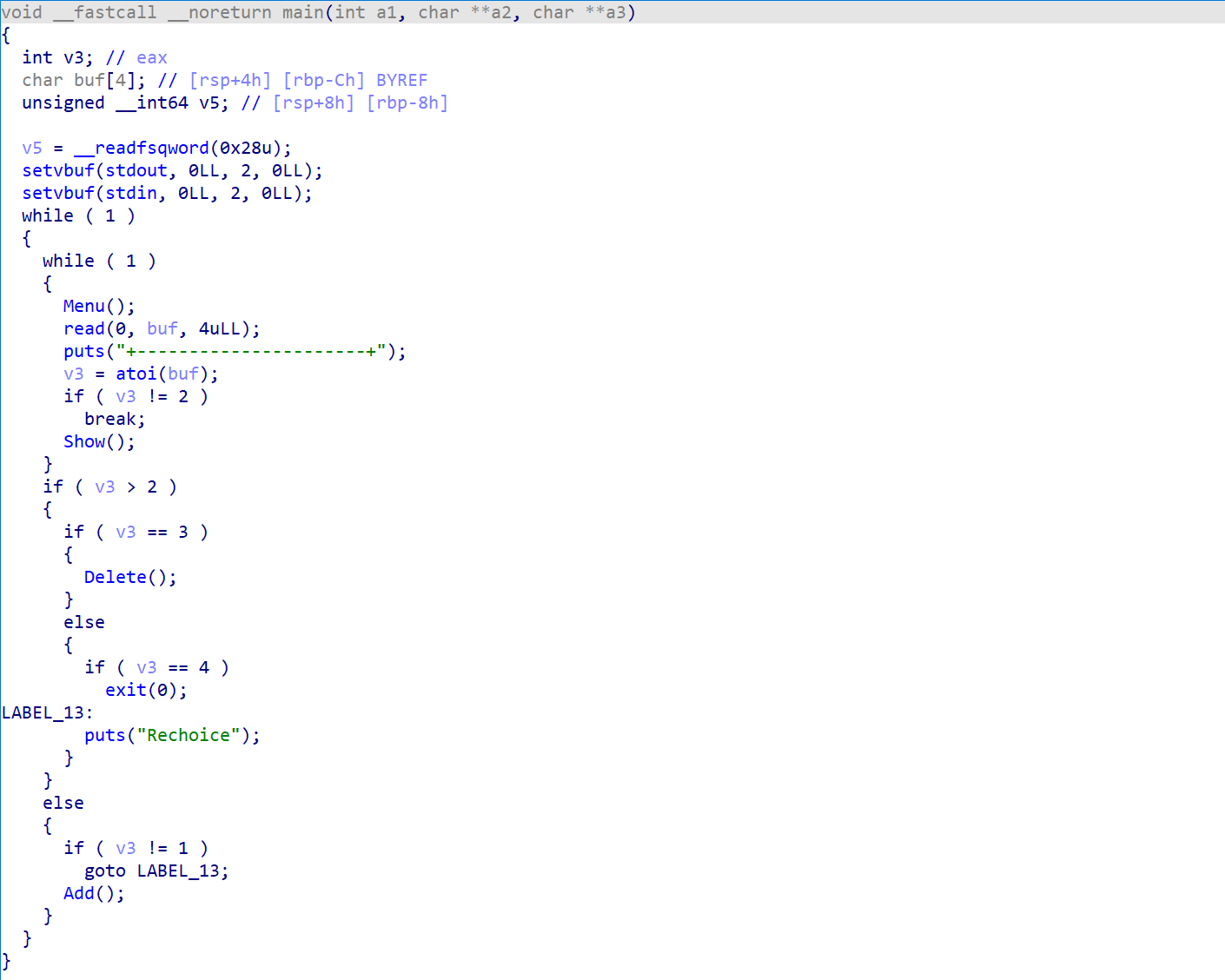 我一般看堆的菜单题,优先看程序的菜单函数,了解到程序存在的所有功能,再利用菜单的选项来对各个功能函数进行命名。命名之后,就是找到 Show 函数,根据 Show 函数的输出信息来设置结构体,例如这道题。