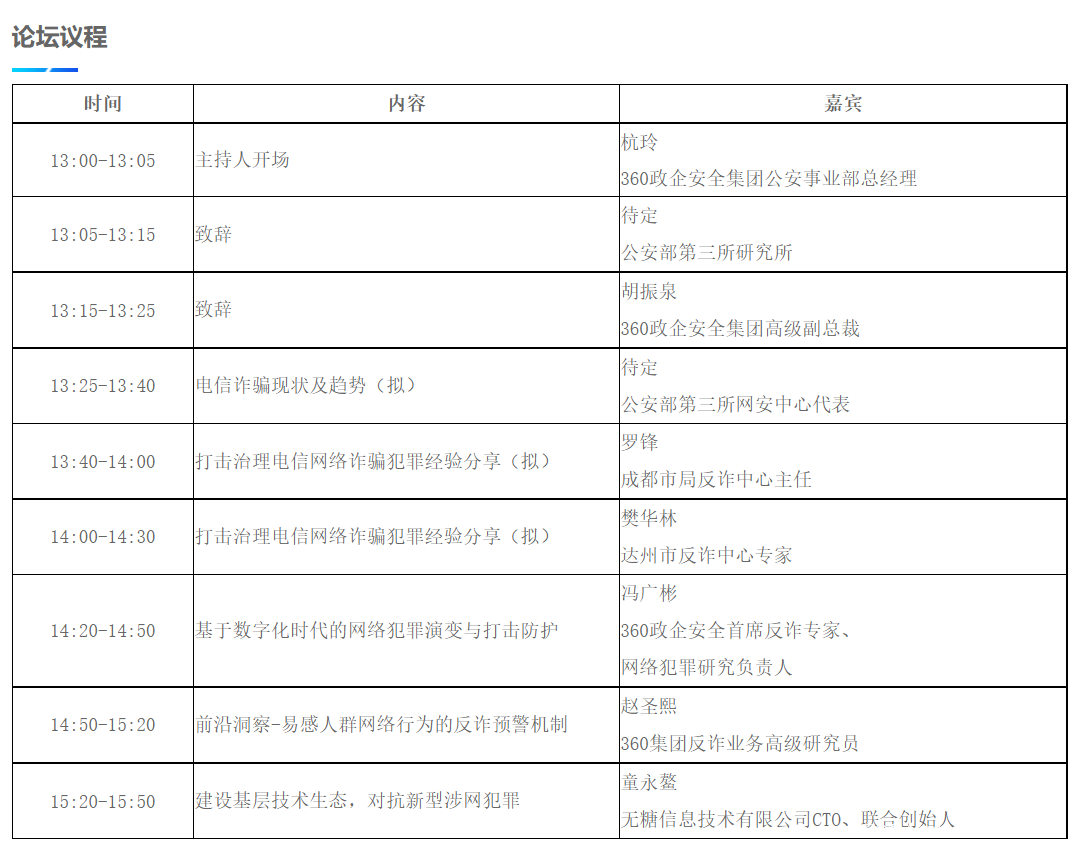 以由360政企安全集团主办,公安部第三研究所指导,无糖信息技术有限公司协办的“打击新型网络犯罪论坛”为例,电信网络犯罪作为互联网时代伴生的一种新型犯罪,给公共安全和国家安全带来了重大危害。习近平总书记在对打击治理电信网络诈骗犯罪工作作出重要指示,强调全面落实打防管控措施,坚决遏制此类犯罪多发高发态势。目前亟需通过多方的共同努力,采取一系列有效措施打击和预防网络犯罪,加强对网络犯罪的治理。据此,本论坛将从新型网络犯罪的发展趋势,打击防范策略,典型案例及新型网络技术对于网络犯罪影响等方面邀请行业内资深专家共同分享和探讨。