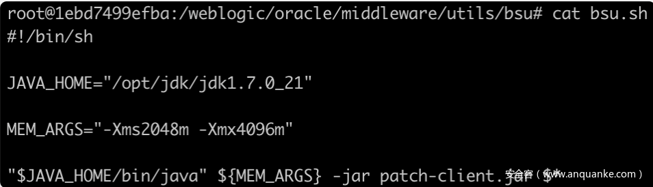后续进入 /weblogic/oracle/middleware/utils/bsu 目录进行补丁安装,在docker中安装weblogic 补丁,需要扩展docker的内存容量,然后修改bsu.sh中的运行内存,不然的话回报各种问题。