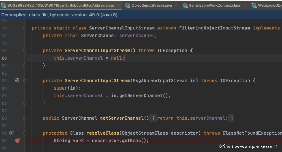 因为readObject反序列化时首先会调用resolveClass读取反序列化的类名,所以我们需要关注的是resolveClass的处理逻辑。