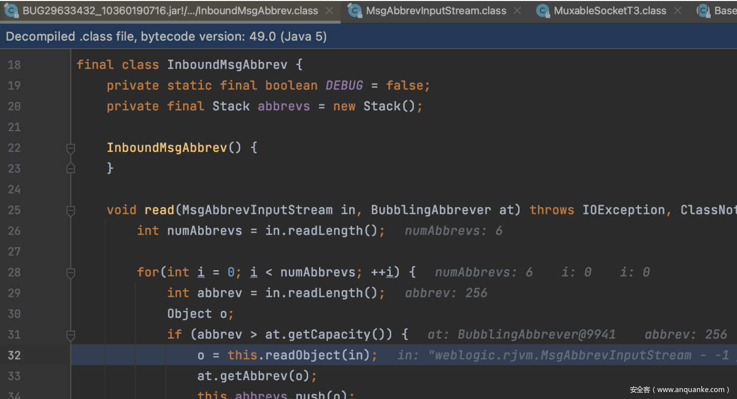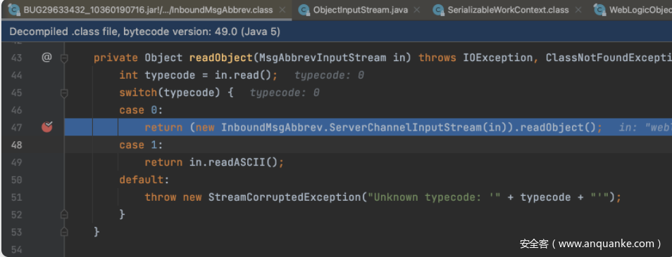 上述代码的第5行正是从序列化数据中读取当前要反序列化类的名字,并在WebLogicObjectInputFilter类的isBlacklistedLegacy函数中进行黑名单匹配,一旦检测出包含就会触发异常。