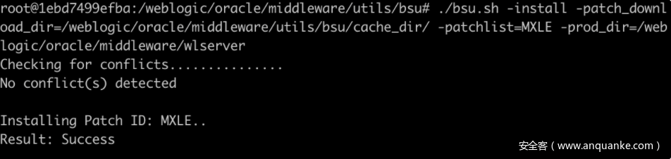 ./bsu.sh -install -patch_download_dir=/weblogic/oracle/middleware/utils/bsu/cache_dir/ -patchlist=MXLE -prod_dir=/weblogic/oracle/middleware/wlserver