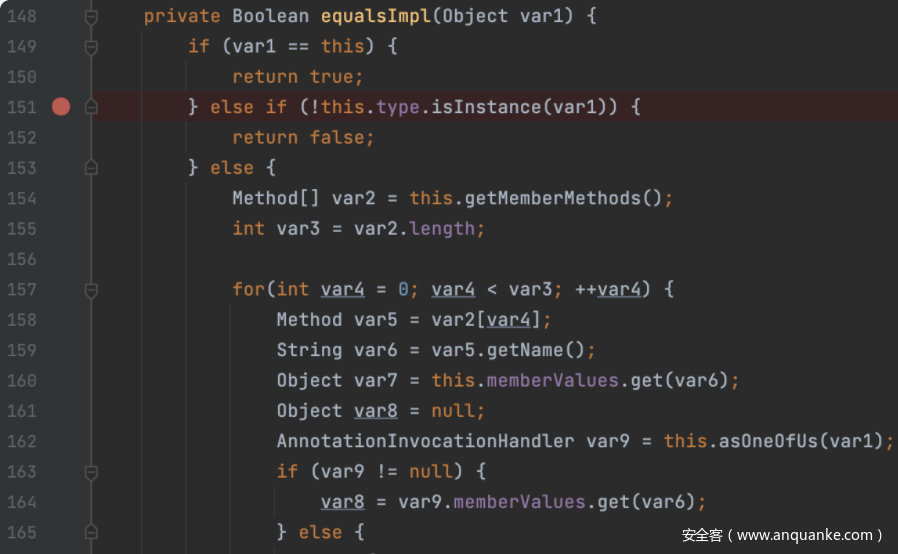 利用AnnotationInvocationHandler创建jdk动态代理后,如果出现了hashmap哈希碰撞,那么在hashmap中会调用AnnotationInvocationHandler的equal方法,间接的调用equalsImpl方法。