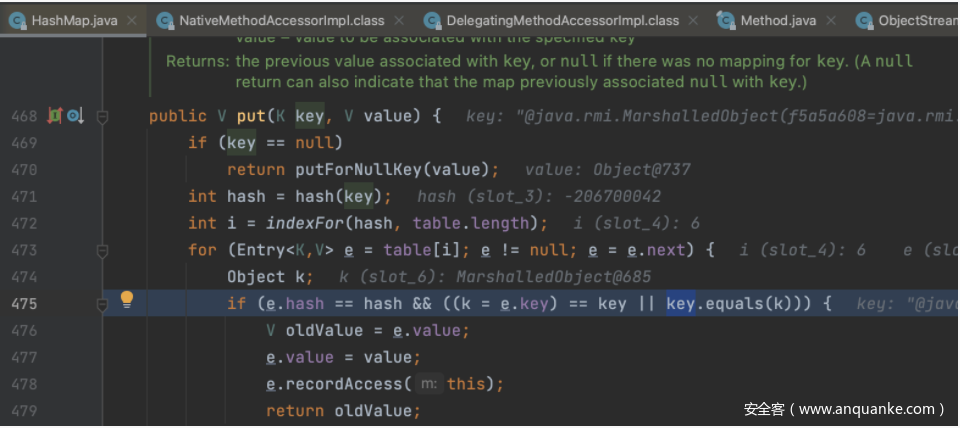 LinkedHashSet在反序列化填入key值时会触发上述代码,其逻辑是会将hash(key)和之前的key的hash进行比较。说到底就是MarshalledObject的hash和MarshalledObject代理类的hash方法的返回值进行比较。