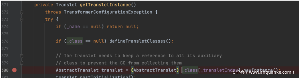 第一个方法就是newTransformer,该方法最终会调用getTransletInstance以及defineTransletClasses方法,最后在运行下面代码的380行时实例化_bytecodes中的类,触发编写好的静态代码块。