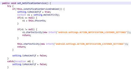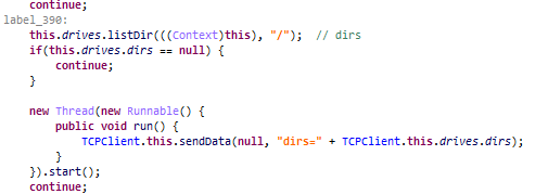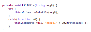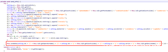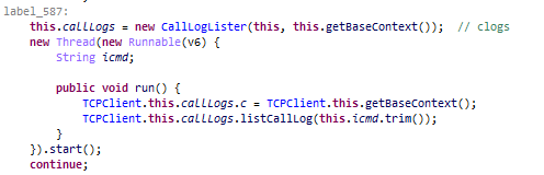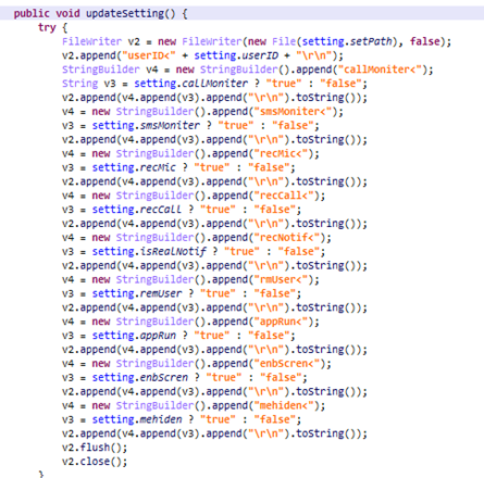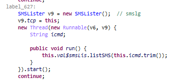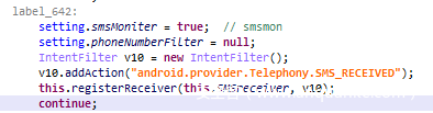 隐藏自身图标来实现隐藏自身,让用户误以为安装并更新了一个正常的应用程序。此恶意程序在后台运行时,则会通过远程服务器下发指令(总计56个指令)来实现对用户进行全方位的监控。其恶意操作有:上传短信信息、上传联系人信息、上传电话记录、屏蔽短信、监听手机状态、开启GPS、远程拍照等操作。