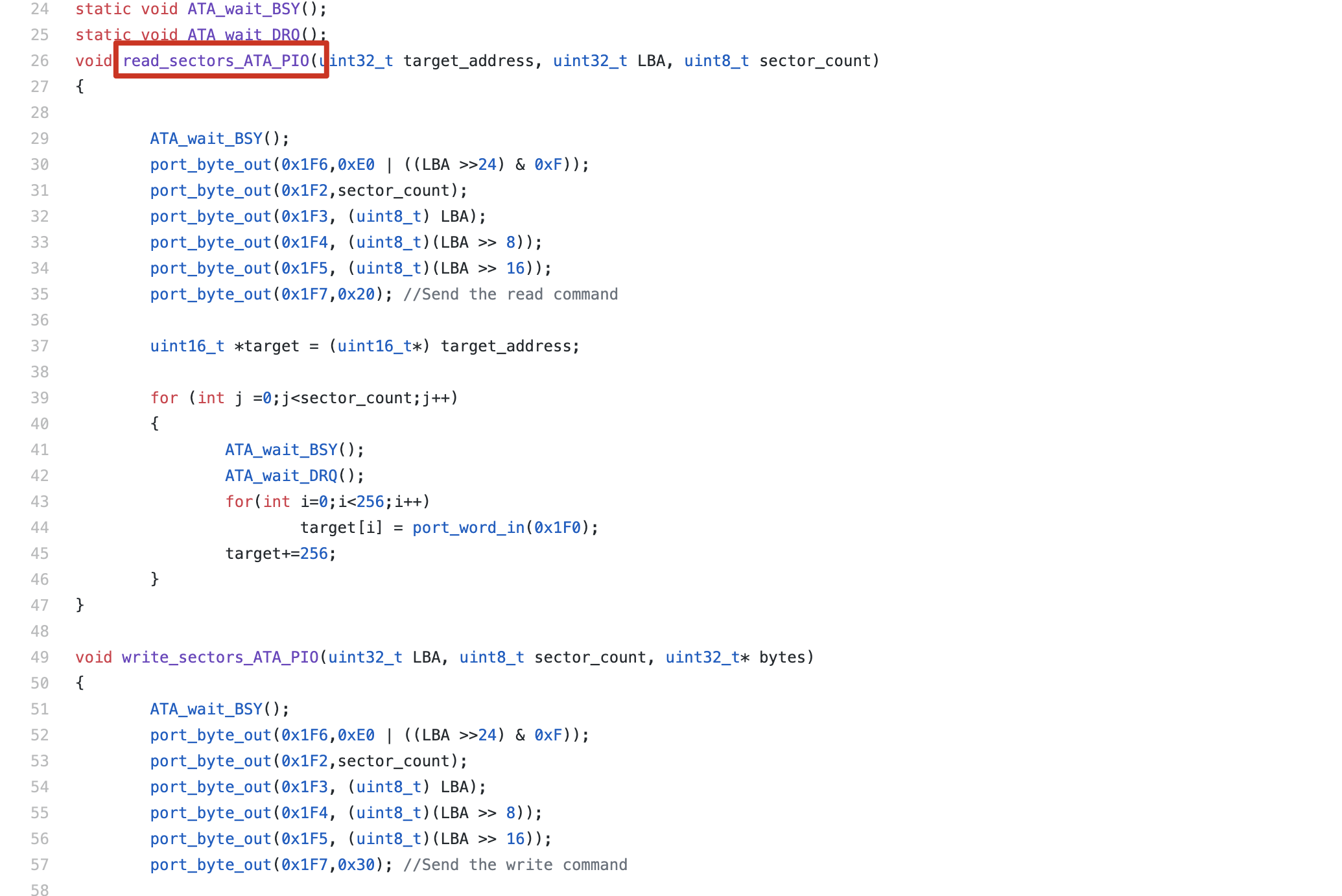 void read_sectors_ATA_PIO(uint32_t target_address, uint32_t LBA, uint8_t sector_count);