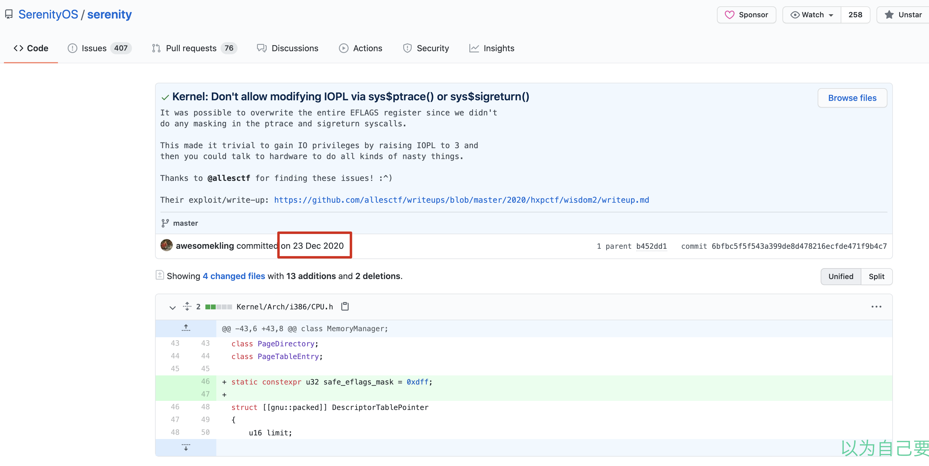 本题来源于hxpCTF 2020的wisdom2,是36c3 wisdom的升级版CVE-2019-20172:36C3 wisdom中的SerenityOS内核提权,该漏洞存在于serenityOS在2020年12月23日以前提交的版本。