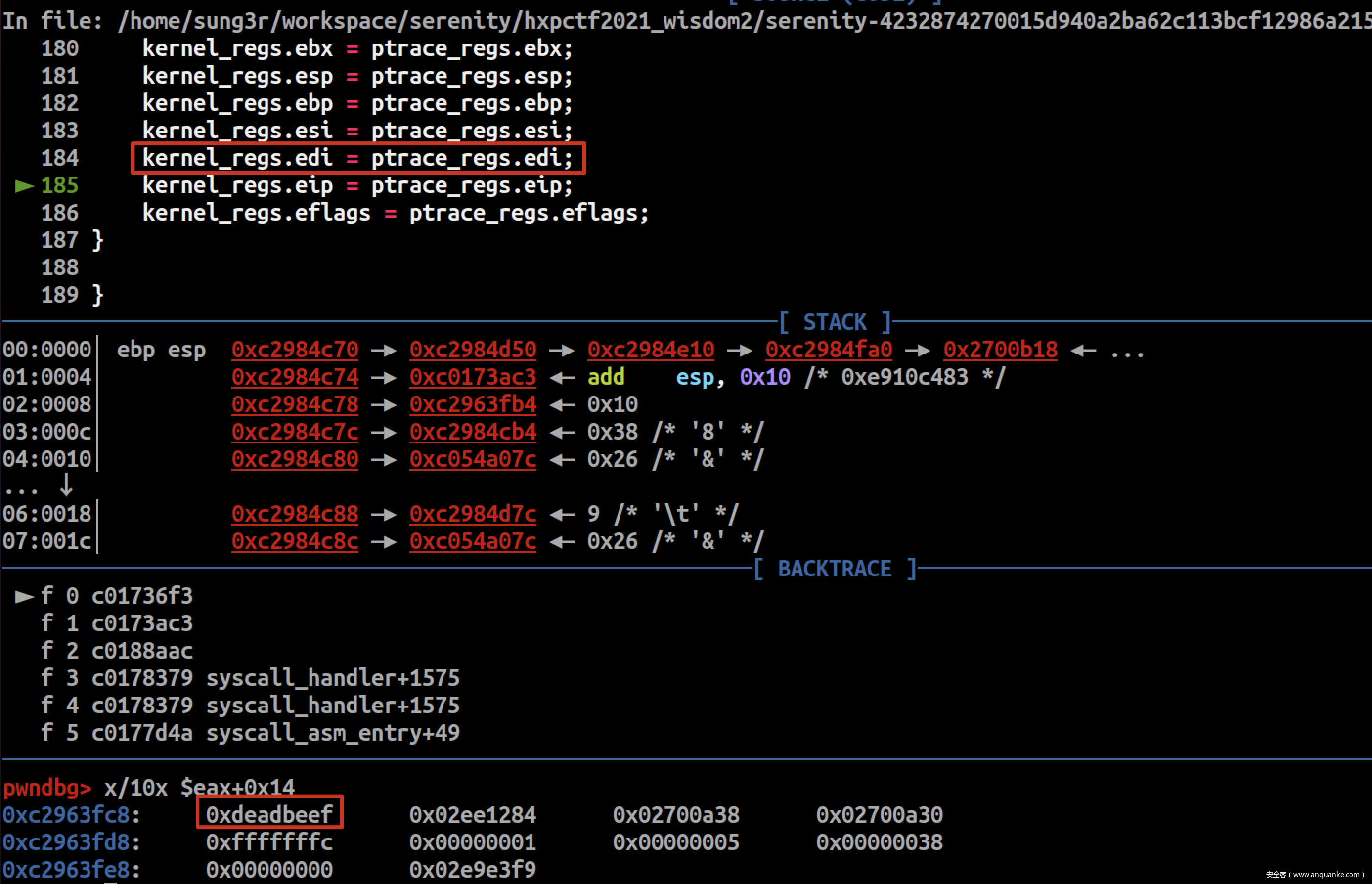 exp修改成将kernel_regs.edi置0xdeadbeef,编译后传到serenityOS