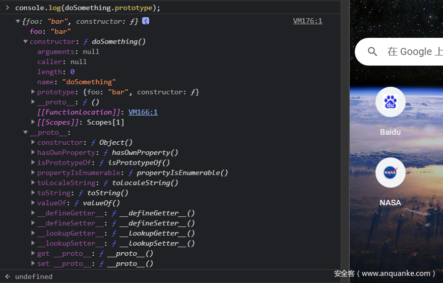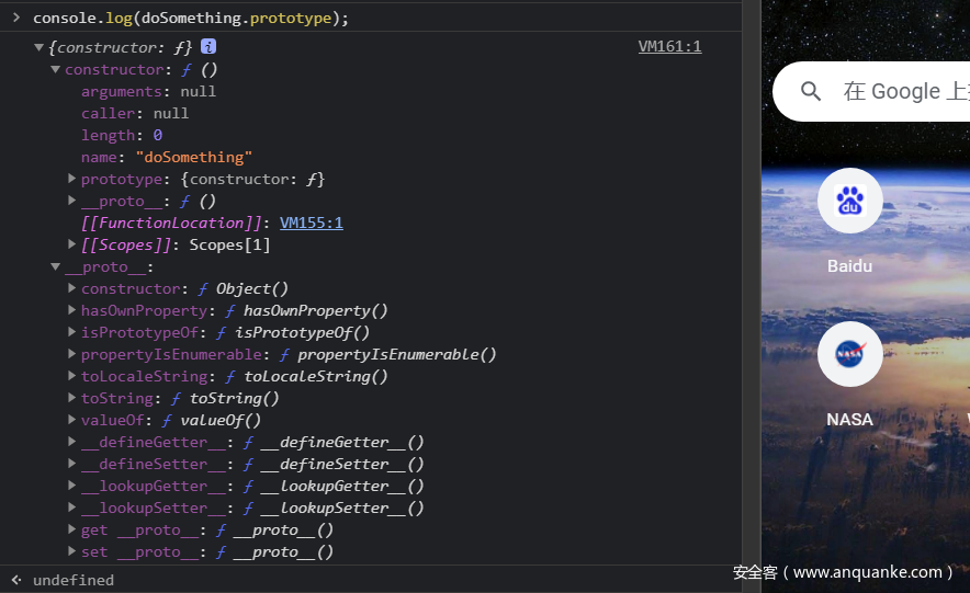 正如之前提到的,在 JavaScript 中,函数(function)是允许拥有属性的。所有的函数会有一个特别的属性 —— prototype 。在控制台显示的JavaScript代码块中,我们可以看到 doSomething 函数的一个默认属性 prototype: