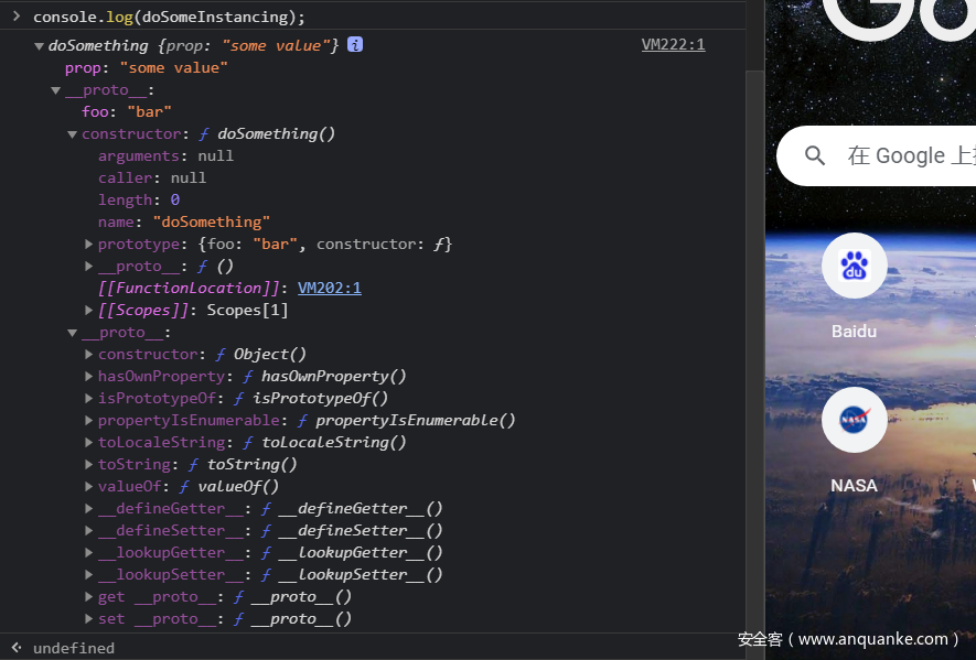 如上所示,doSomeInstancing 中的 __proto__ 是 doSomething.prototype 。但这是做什么的呢?当你访问 doSomeInstancing 中的一个属性时,浏览器首先会查看 doSomeInstancing 中是否存在这个属性。