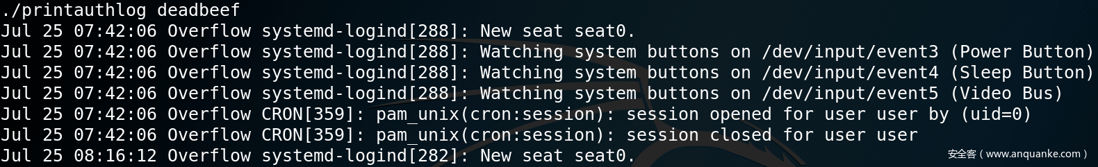 由于printauthlog接收的是命令行参数,所以需要借助perl来输入“x08”这样的特殊字符(靶机中没有Python)。实际执行如下的命令完成攻击: