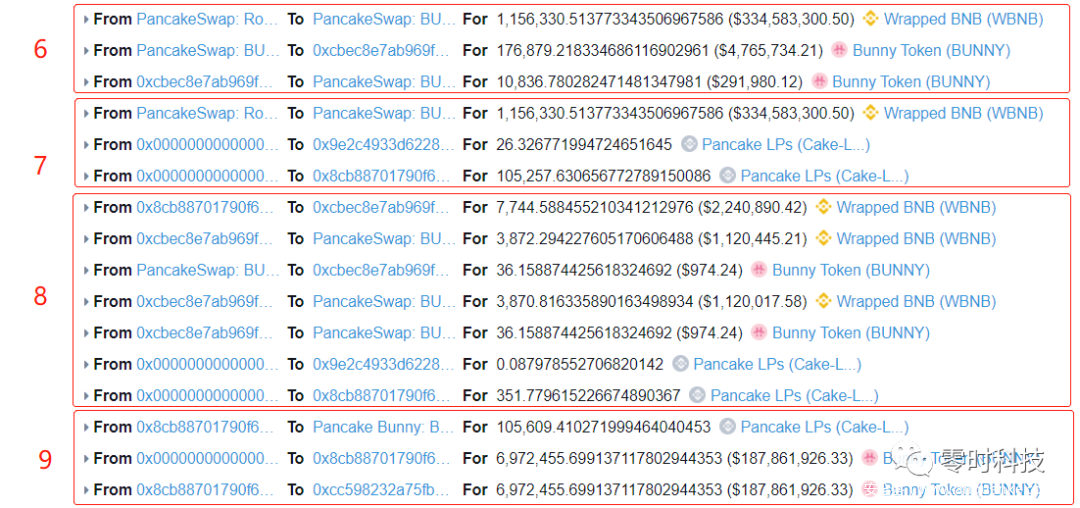 该笔交易中,攻击者使用1枚BNB,并在提供流动性时对半分为0.5枚BNB和189枚USDT,提供流动性后得到USDT-BNB LP,之后将该LP存入Bunny池子。