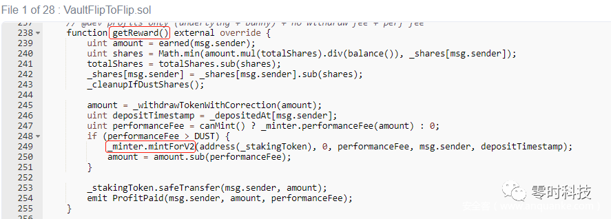 通过前面的分析,攻击者已将大量资金注入池子,并通过VaultFlipToFlip合约中getReward方法来获取奖励,如下图所示: