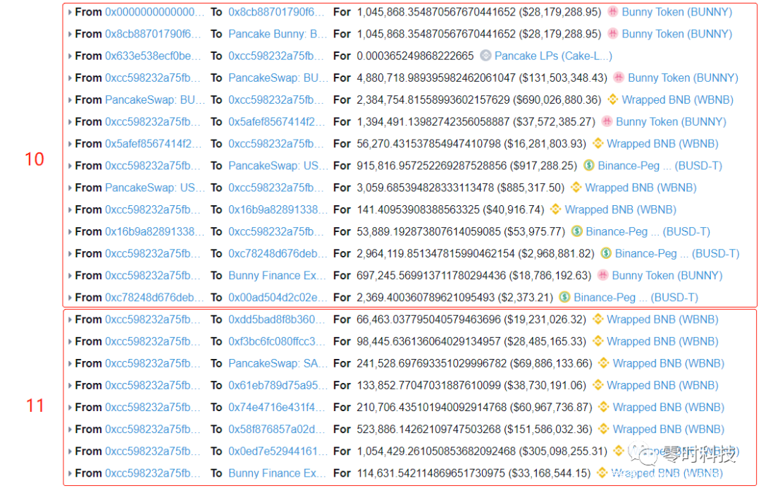 第十步:将获取的697万枚Bunny资金转换为BNB和USDT,并给攻击者钱包地址转入69万枚Bunny。
