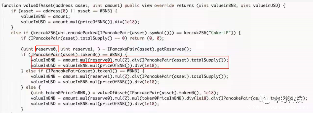 mintForV2方法中,最终铸币的数量mintBunny变量是由valueInBNB变量通过简单计算得到,而valueInBNB变量是通过PriceCalculator合约中valueOfAsset方法得到,继续跟进,如下图: