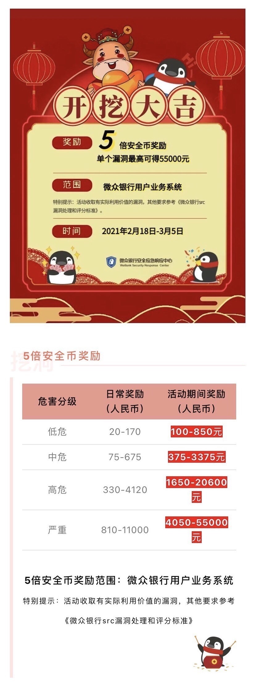 单个漏洞税后最高可拿55000元,快来创造你的牛年new战绩吧!