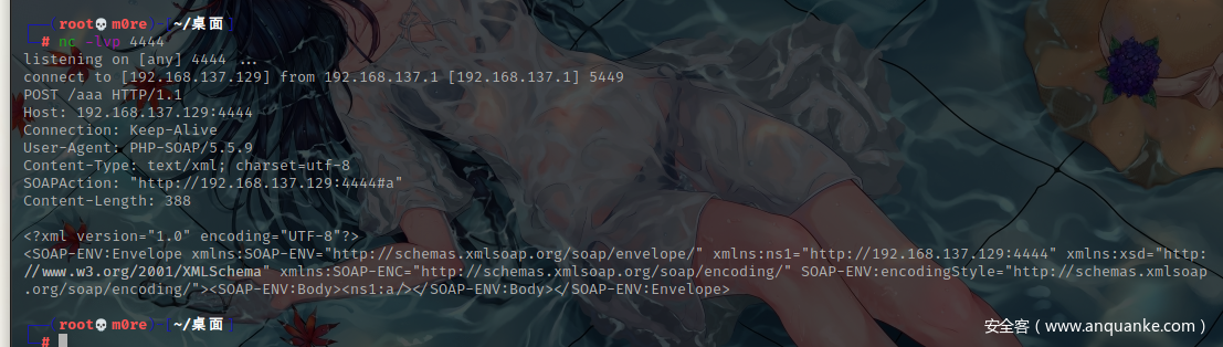 kali开启监听nc -lvp 4444,执行该文件。【注意开启soap模块】