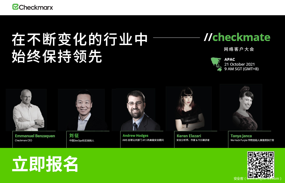 报名链接:https://checkmarx.com/event/checkmate_customer_conference_2021/developers/