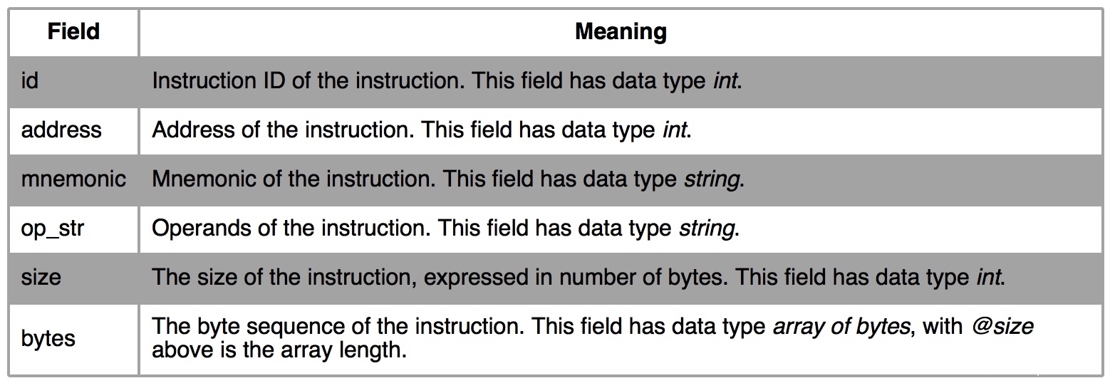 print("%d\t0x%x:\t%s\t%s\t%s" %(i.id,i.address, i.mnemonic, i.op_str,i.bytes.hex()))