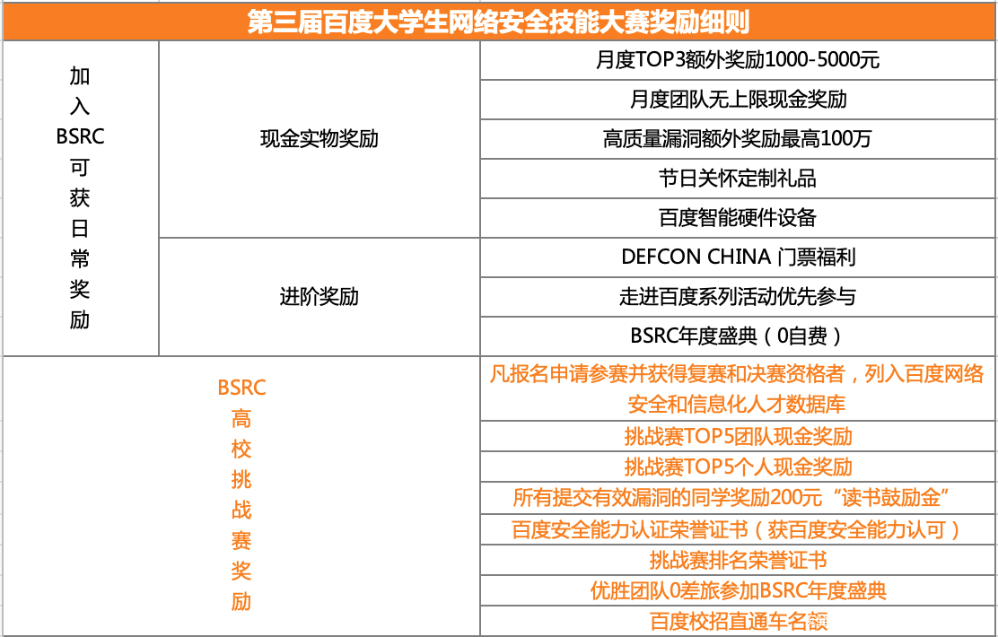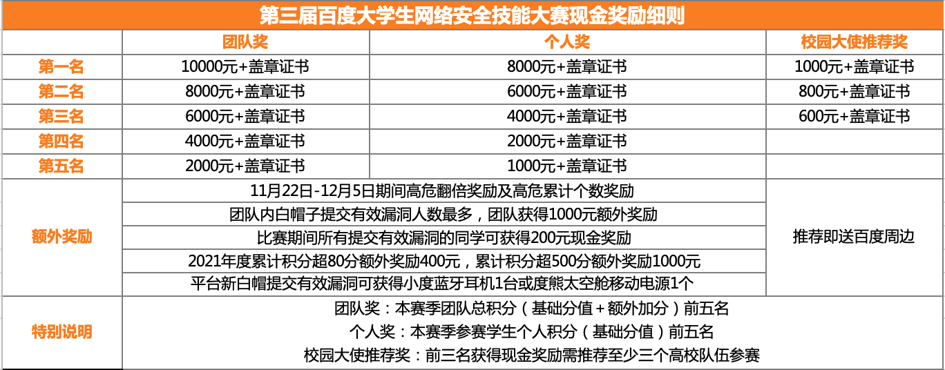 除百度安全应急响应中心日常奖励外,设置优胜团队奖、优秀个人奖、校园大使推荐奖,比赛结束后,将现场为获奖人员和团队颁发以下奖项及奖金: