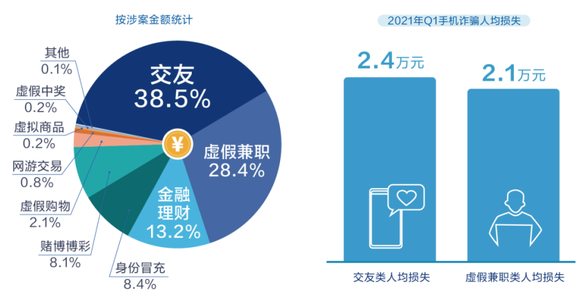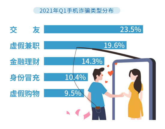 “交友”需谨慎,损失价很高!2021年第一季度,在所有诈骗申请中,交友诈骗占比最高达23.5%;