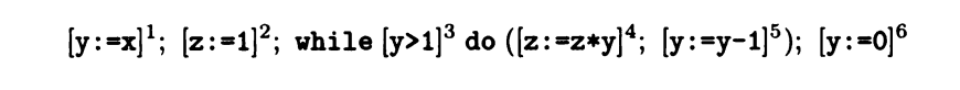 我们可以看见一系列形如[ y := x ]的表达式。这是对赋值运算的描述,右上角的数字属于语句的标签。一个完整语句用 ; 结尾。同时我们还用( )对块语句进行包裹以解决歧义。此外,[ y > 1 ]是逻辑运算的描述。这样的描述方式可以让我们识别程序的基本架构,同时又不需要画出流程图